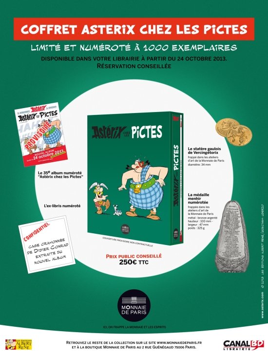 A edição de luxo, distribuída por La Monnaie, inclui uma caixa imitando um livro, com uma medalha em formato de menir, numerada; uma edição do álbum Asterix entre os Pictos, numerada, com uma capa exclusiva, diferente das outras edições; um ex-líbris, numerado, reproduzindo em preto e branco o primeiro quadro da página 21 da HQ; e uma ficha no formato de moeda antiga (jeton statére) gaulesa com a palavra Vercingétorix. Essa caixa tem tiragem limitada e numerada de mil exemplares e custa 250 euros.